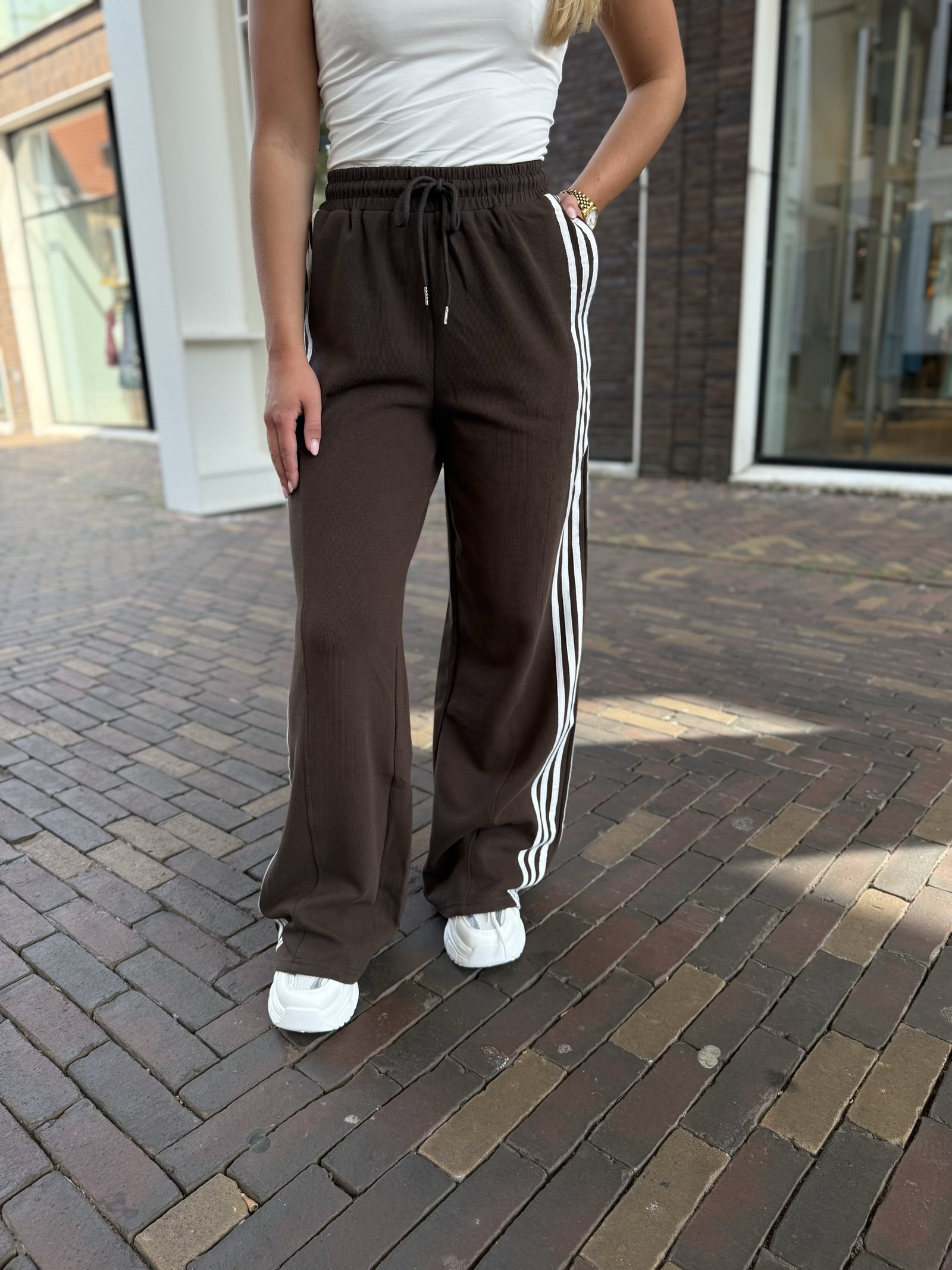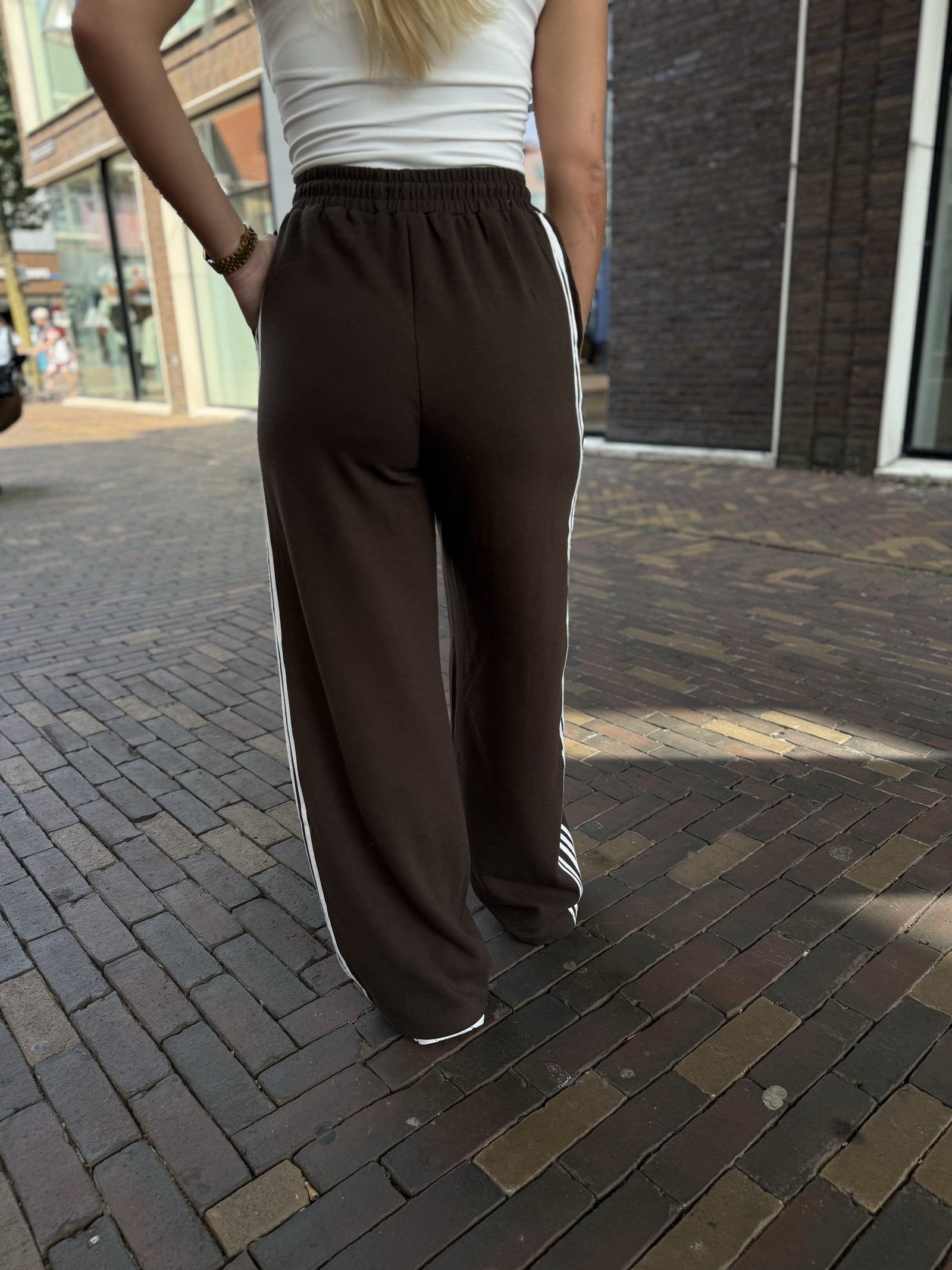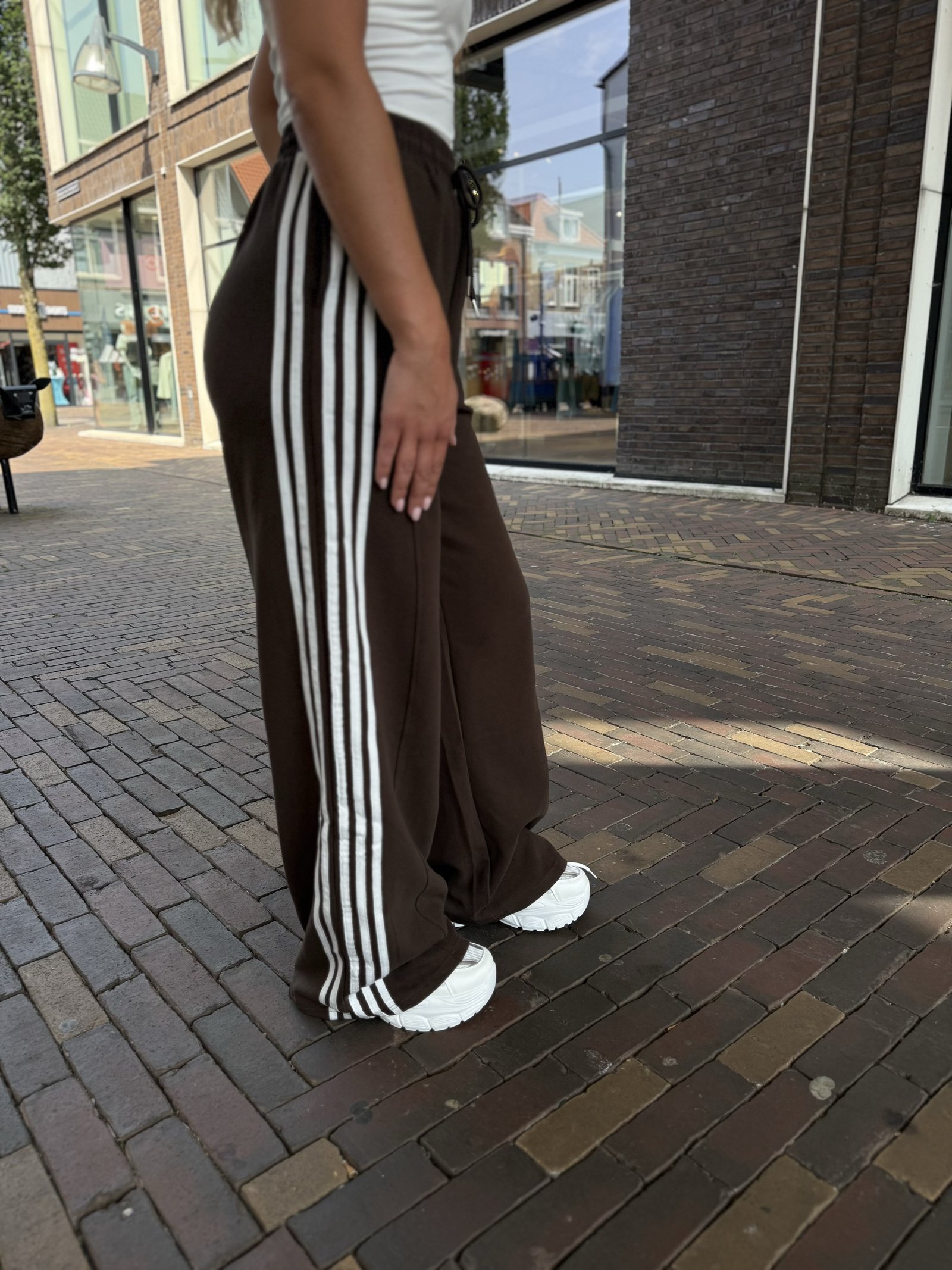 De bruine loose fit broek met witte strepen is de perfecte mix van sporty en stijlvol. Het losse model zit relaxed op de heup en valt wijd langs het been, waardoor je look een effortless en comfortabele uitstraling krijgt. De verticale strepen aan de zijkant geven een sportieve touch én laten je benen optisch langer lijken.