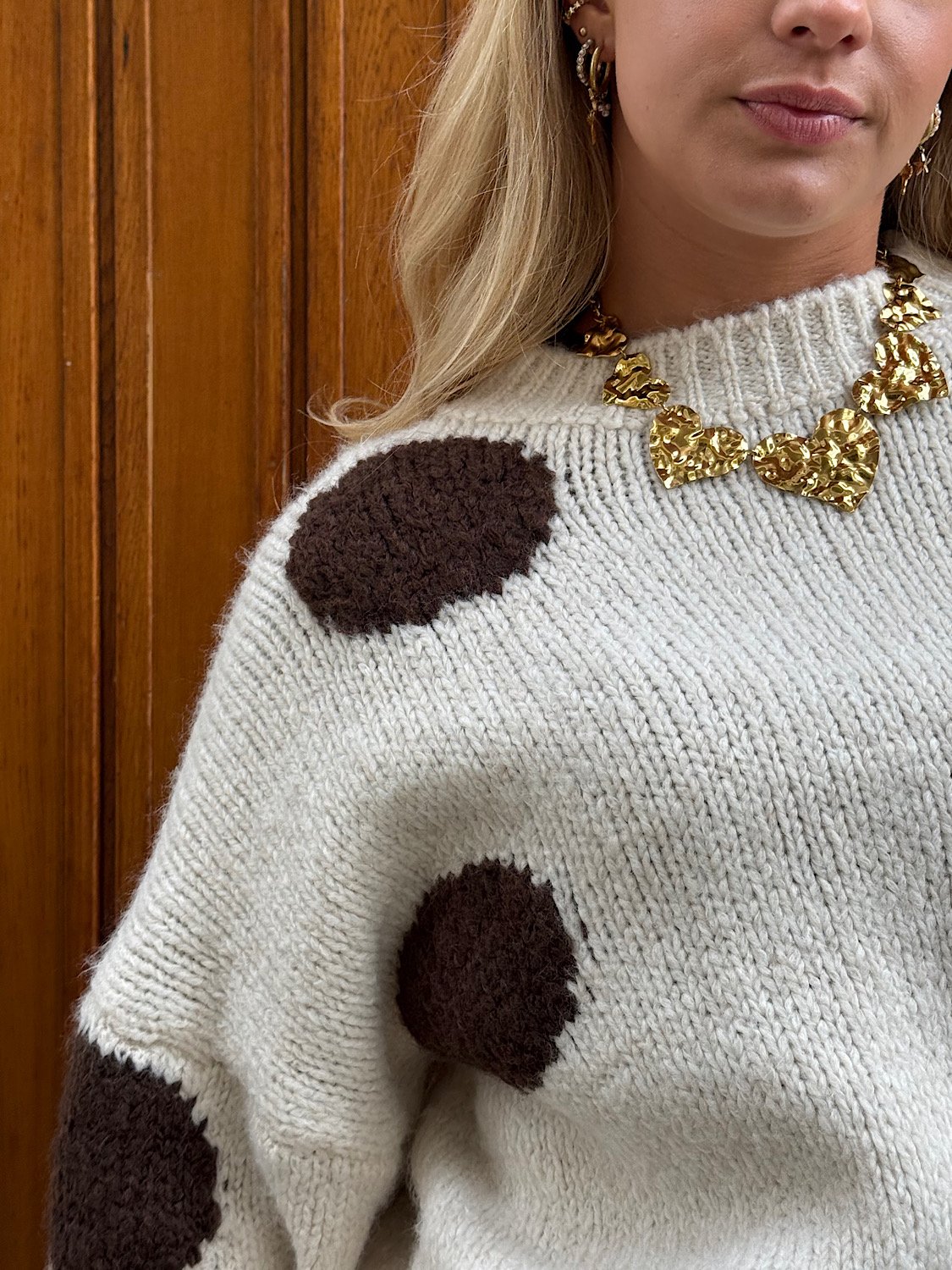 Ecru gebreide trui met bruine stippen