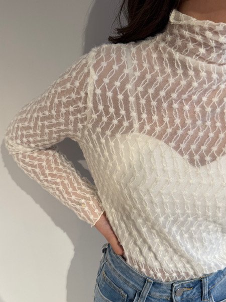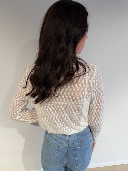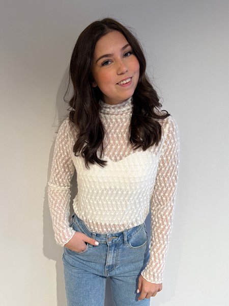 De Lucy top moet jij in je kast hebben! Het is de perfecte middenweg tussen kant en mesh. De Lucy top heeft een mooi stipjes patroon en een colletje. Draag de Lucy top onder de Nova trui met een gave jeans eronder en je bent klaar voor de dag! De top is onesize en draagbaar van XS tot L.