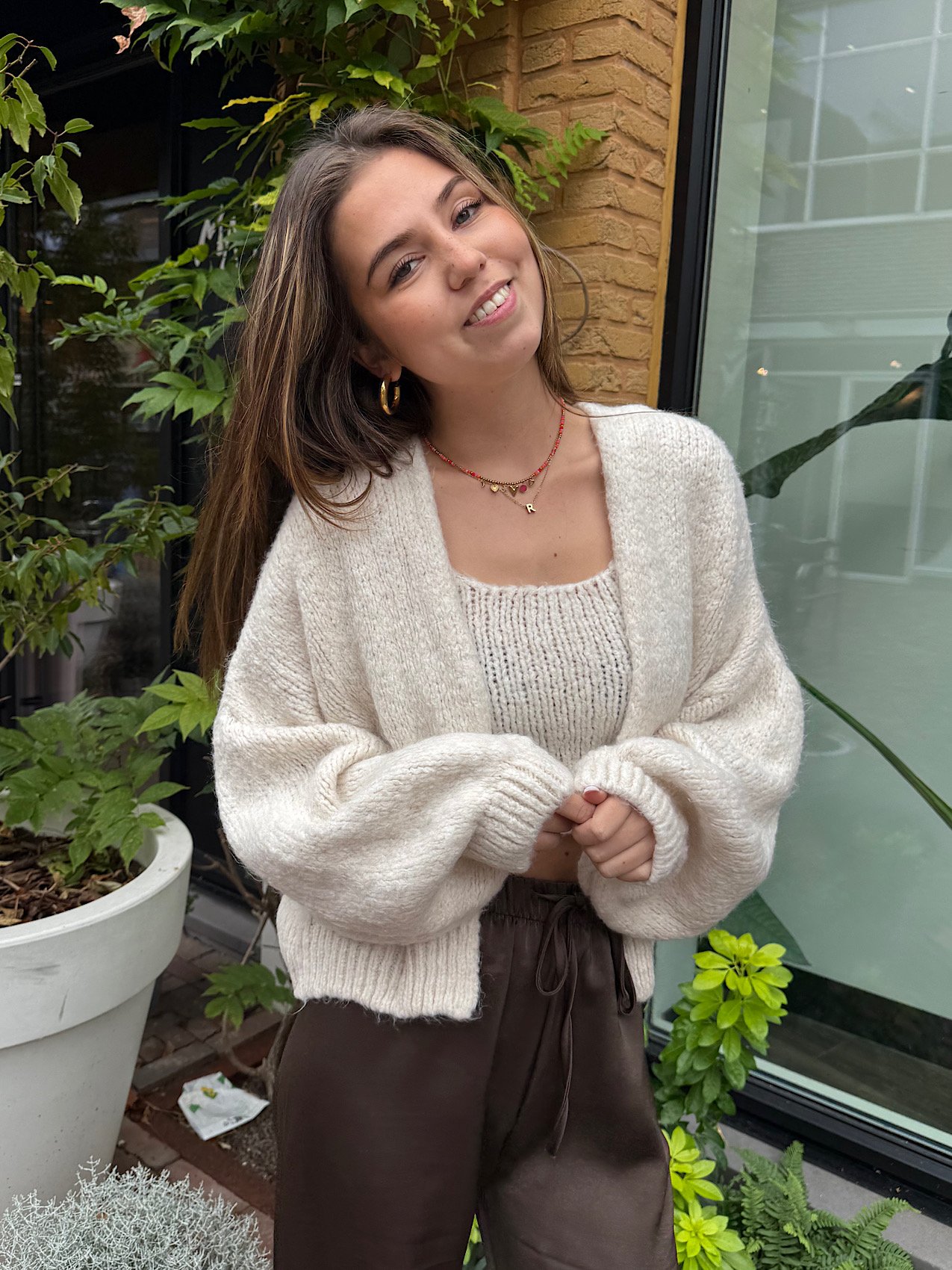 Cosy en girly in één: onze Ziza knit set is jouw nieuwe go-to voor knusse dagen én cute outfits. De set bestaat uit een mouwloze, aansluitende top met elastische rib en een zacht, losvallend vest met puffy mouwen. De knit voelt superzacht aan (geen gekriebel!) en geeft die fluffy, cloud-like look waar je hart sneller van gaat kloppen. Draag samen voor een complete set of mix & match met je favo jeans, rok of satijnen pants.