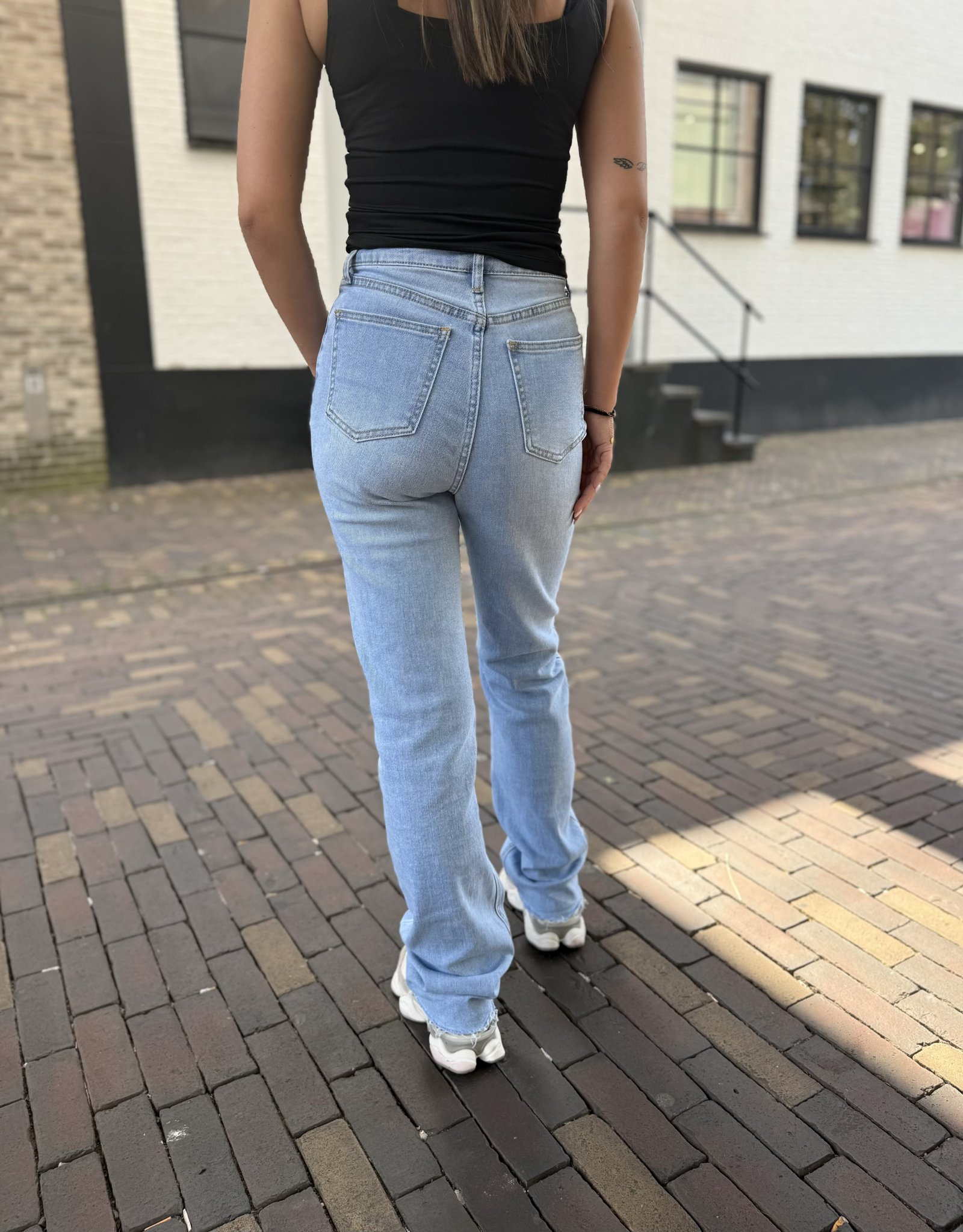 De lichtblauwe extra tall straight leg jeans is gemaakt voor lange benen en een effortless fit. Met zijn high waist pasvorm en rechte pijpen creëert hij een tijdloos silhouet dat je moeiteloos van casual naar chic stylet. De extra lengte zorgt voor die perfecte aansluitende look, zelfs als je langer bent of van een langere fit houdt.
