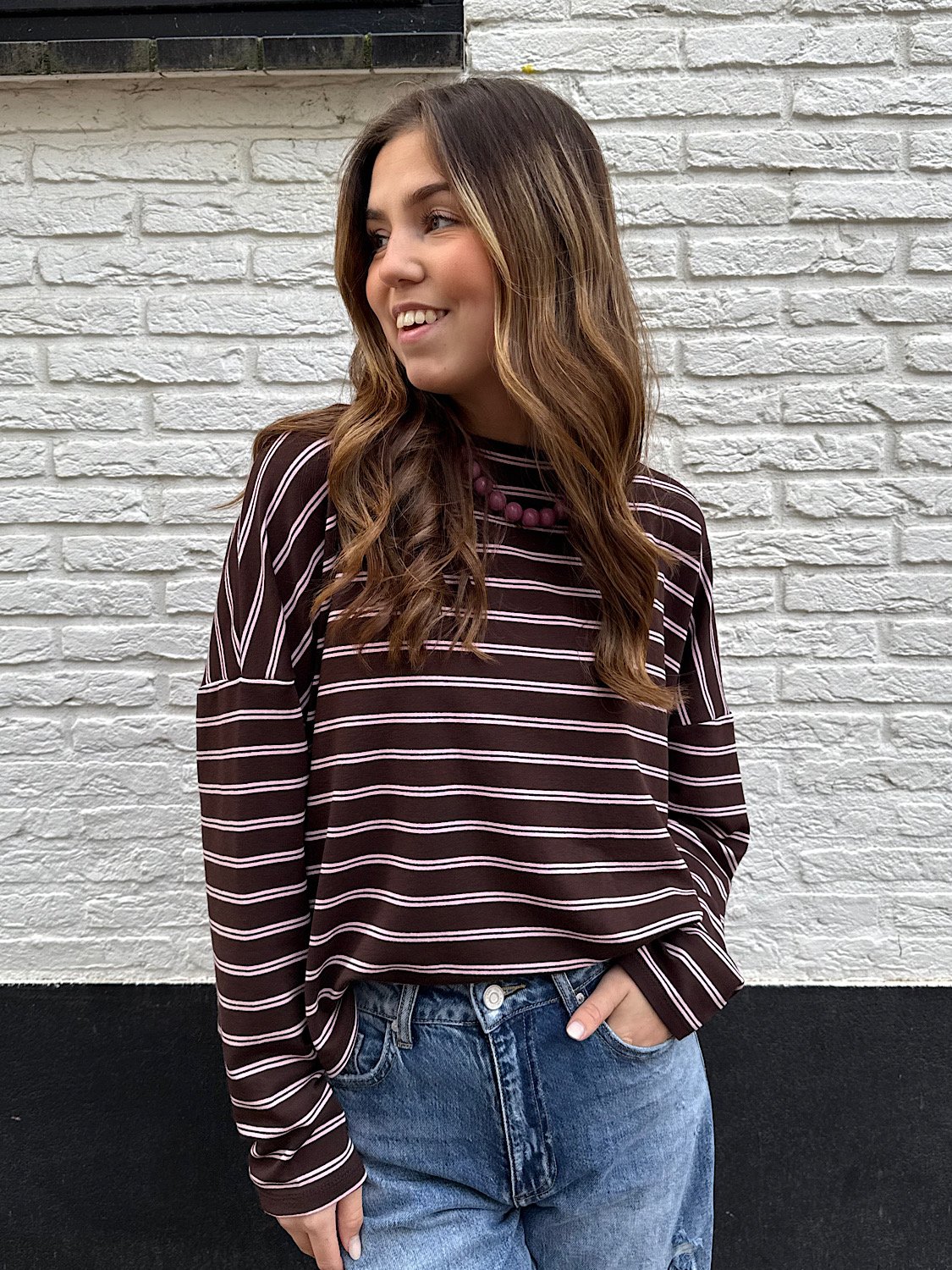 Of je ‘m styled in je jeans, op een rokje of met een gilet erover — deze top past letterlijk overal bij. Verkrijgbaar in twee kleurvarianten: bruin met blauwe streep en bruin met roze streep.