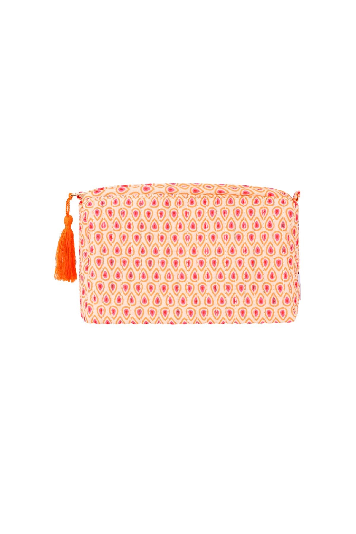 Zomer vibes in een tasje. Deze oranje make-uptas met vrolijk printje en speelse kwast is perfect om al je beauty essentials in stijl mee te nemen. Van strandvakantie tot sleepover, dit is je go to pouch.