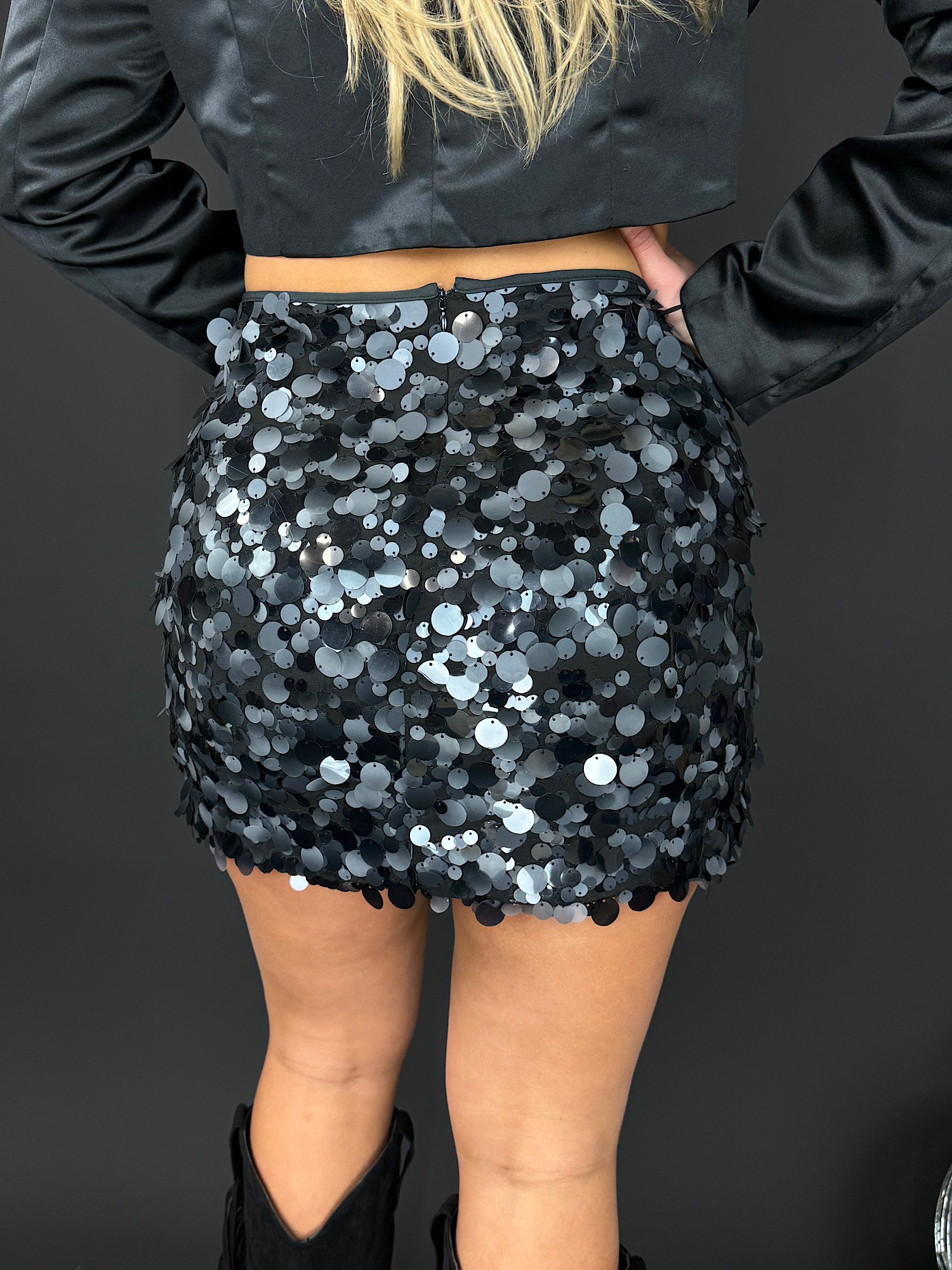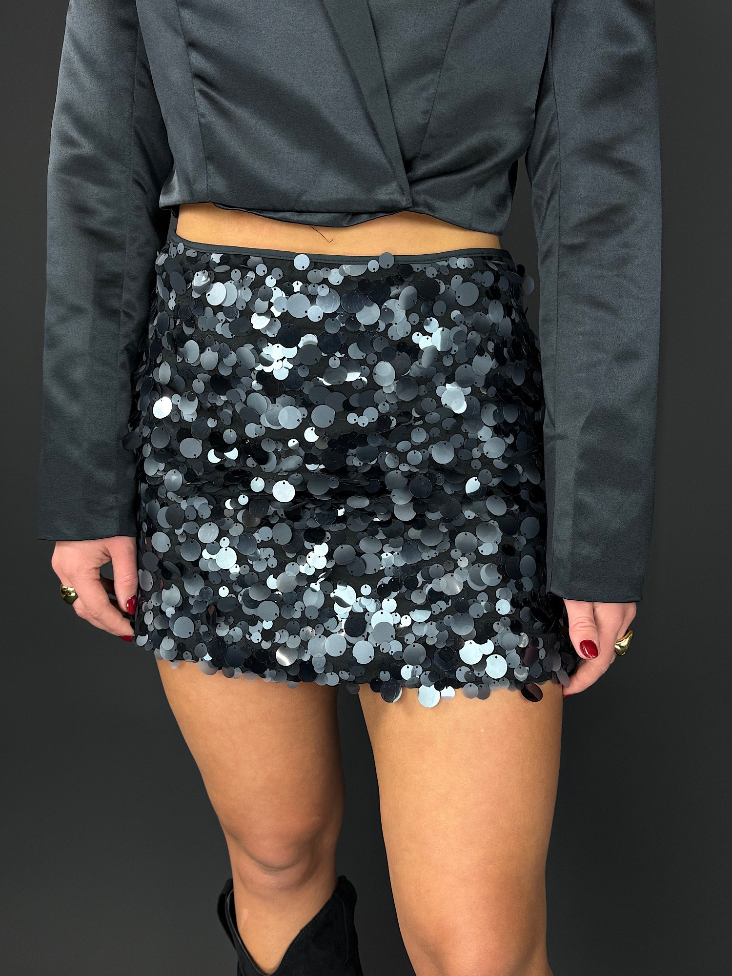 De fit is mooi aangesloten en laat je benen fantastisch uitkomen. Door de grote pailletten krijgt het rokje een luxe, almost couture vibe, maar blijft ’ie verrassend makkelijk te combineren. Draag ’m met een basic top of knit voor contrast, of ga all-in met een blazer of statement top.