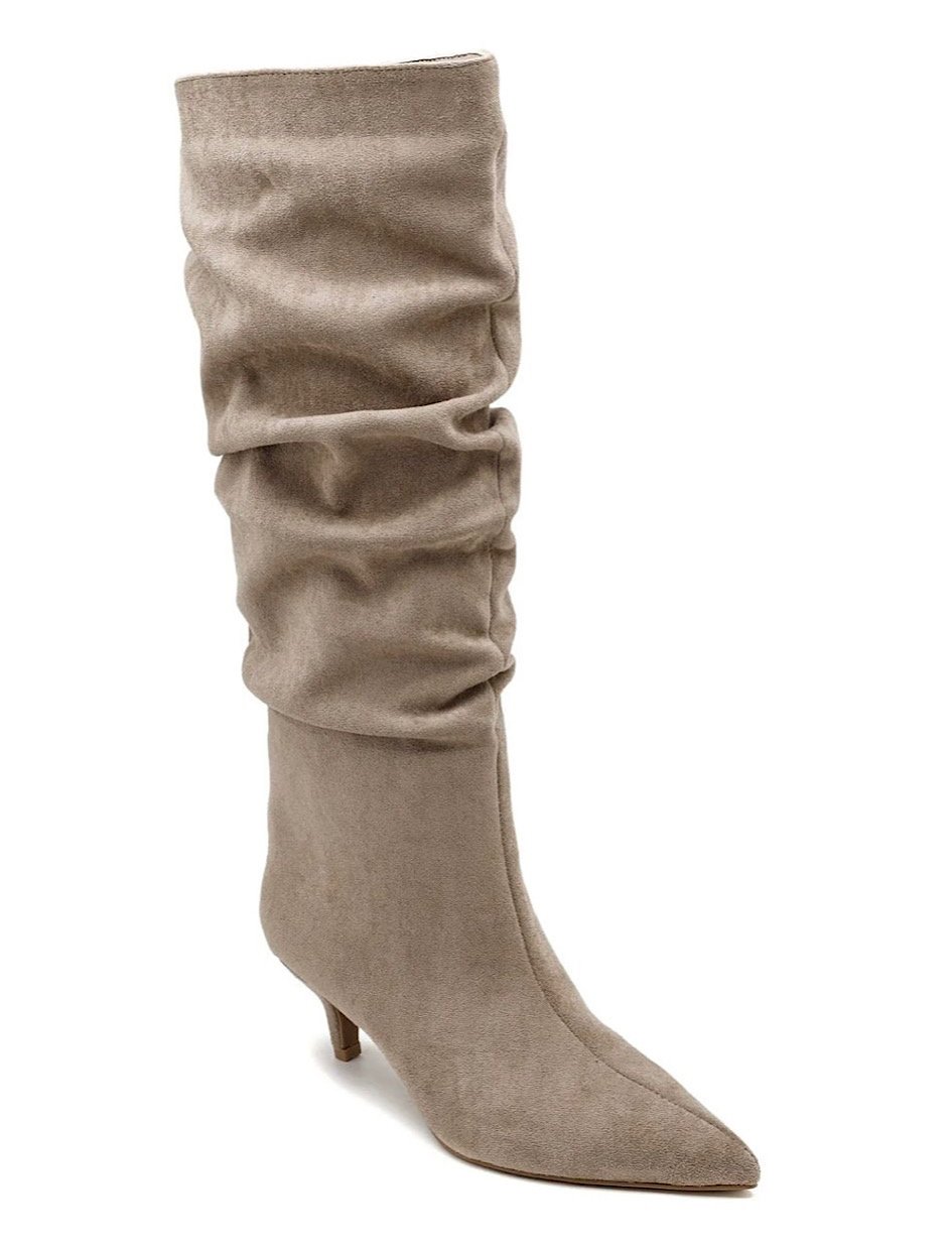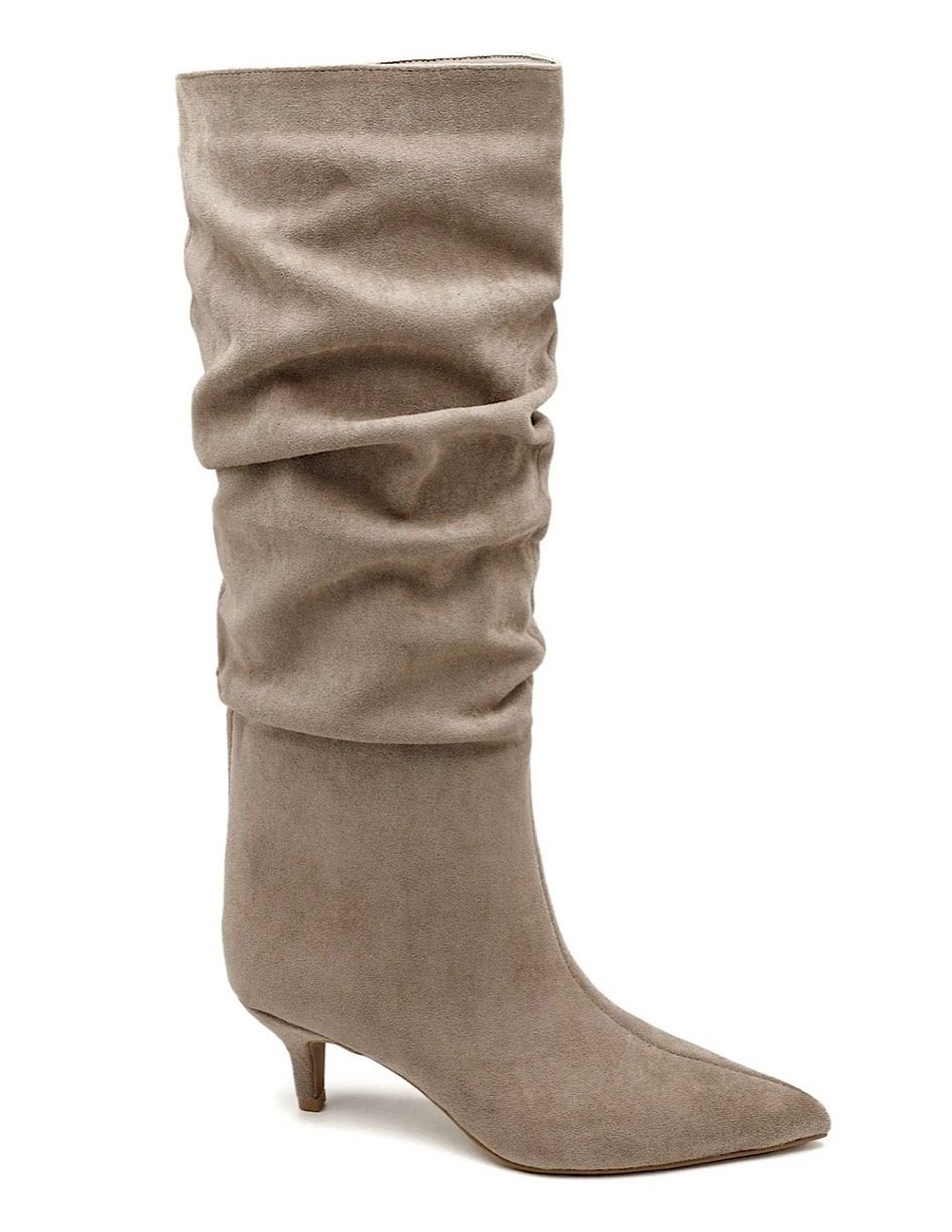 Deze slouchy knie-hoge laarzen geven elke outfit meteen een elegante upgrade. Het zachte suède-look materiaal valt mooi geplooid om het been en zorgt voor die nonchalante, luxe uitstraling waar je eindeloos mee kunt combineren.