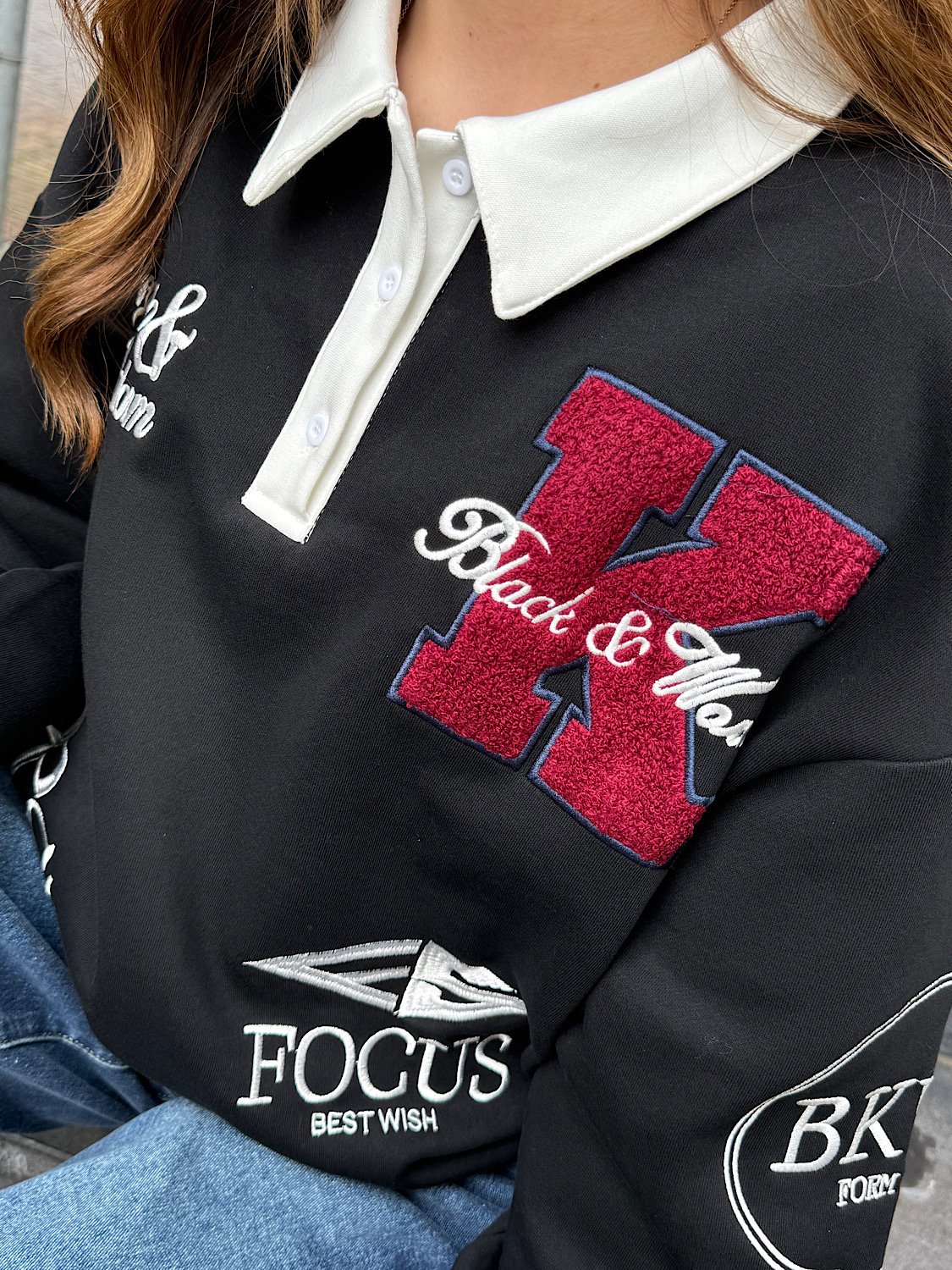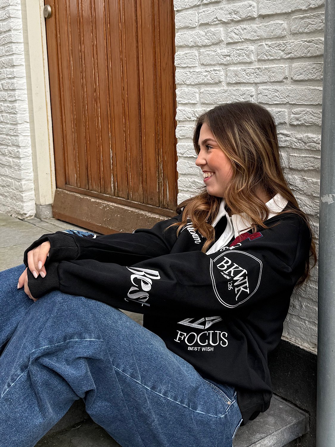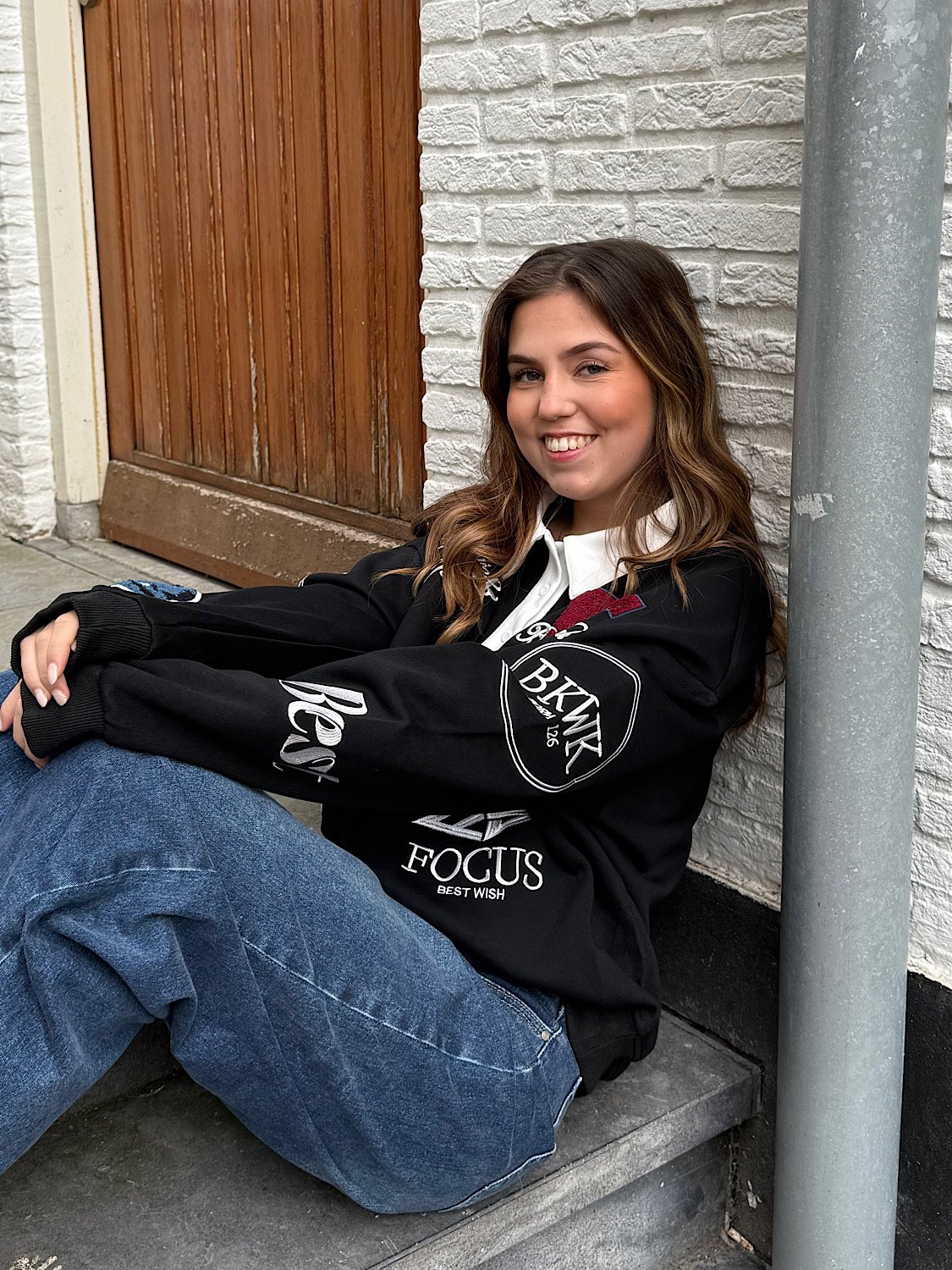 Comfy, stylish en een tikkie preppy — deze polo sweater is alles wat je nodig hebt. Gemaakt van een dikke, zachte stof met een oversized fit die heerlijk zit. De contrasterende kraag en stoere patches geven de trui een trendy streetstyle look, terwijl de binnenkant zacht aanvoelt voor maximaal comfort.