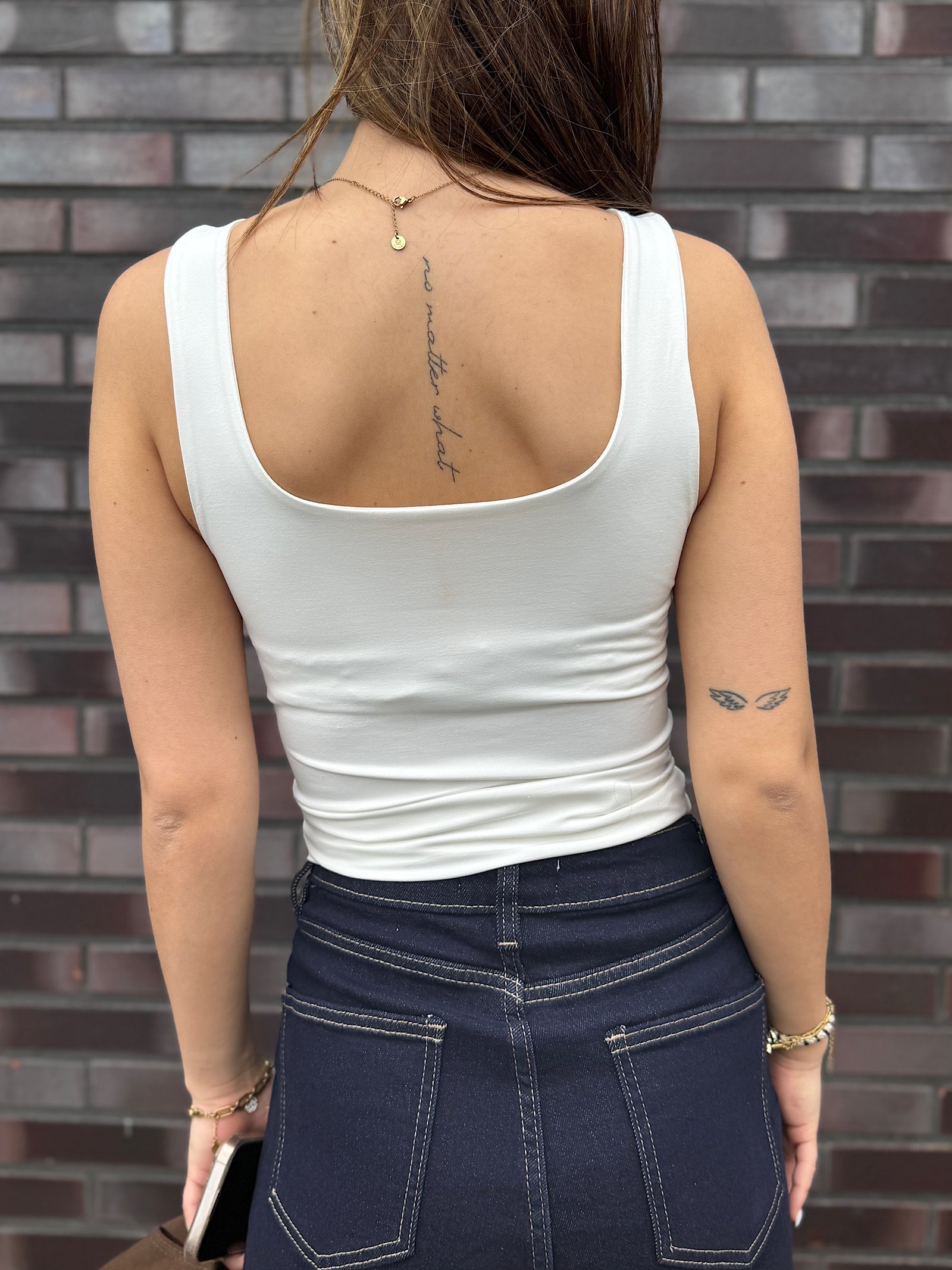 This ain’t just a top – dit is dé top die je elke dag wil dragen. Gemaakt van stretchy stof voor that comfy fit en dubbel gevoerd bij de borst (no bra, no problem ?). De vierkante hals geeft die clean girl vibes, maarrr… plot twist: je kunt ‘m ook achterstevoren dragen. Ja echt – voor een classy high neck en een sexy low back.