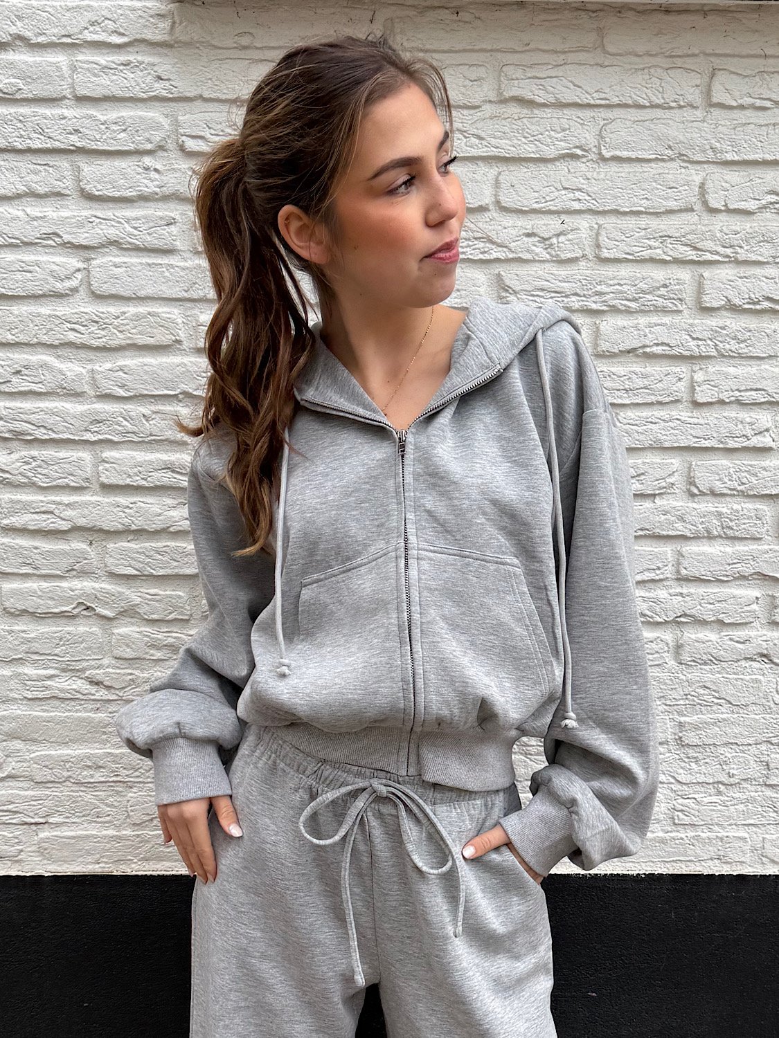 De ultieme comfy basic voor je everyday look. Deze grijze zip hoodie heeft een iets cropped lengte en een relaxed oversized fit. De zachte binnenkant maakt ‘m heerlijk warm en cozy, terwijl de hoodie en zakken zorgen voor die nonchalante streetstyle vibe.